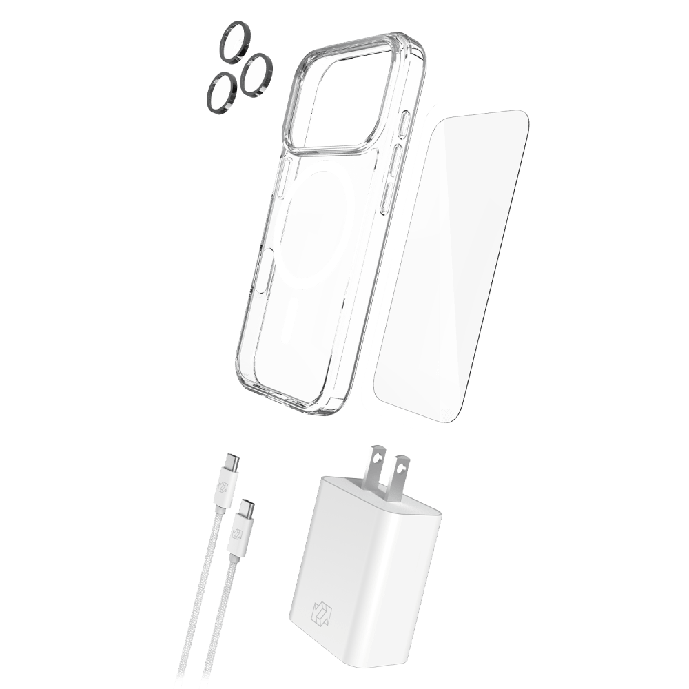 Everything you need for your iPhone 17 Pro Max / 16 Pro Max in one kit. Includes a MagSafe compatible case, glass screen protector, camera lens protector, 30W power block, and 6ft charging cable.