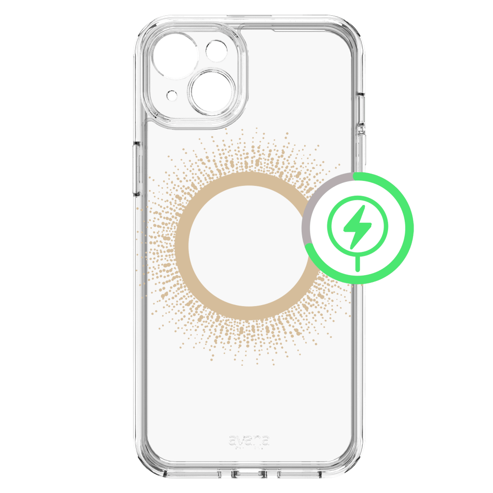 Love MagSafe but hate the ring? Avana has got you covered! A beautiful metallic foil design that shines and conceals the magnet ring on this clear case. This case combines style and protection effortlessly. It's super flexible and lightweight, so you won't even notice it in your pocket. It can handle drops, scratches, and cracks like a champ. Plus, the raised edges make sure your screen and camera stay safe from any potential damage.